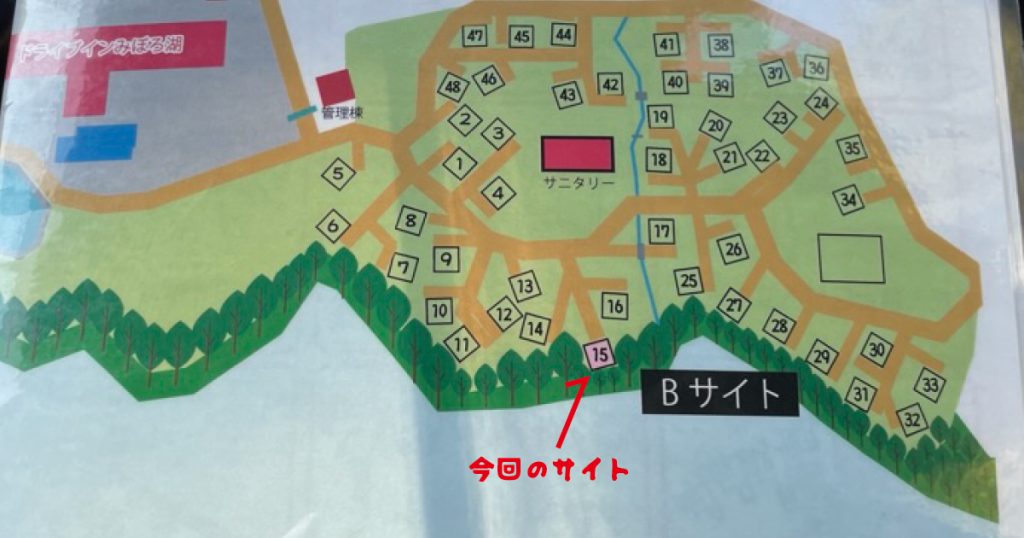 今回選んだサイトは、湖側に少し木が茂っており、茂みの間から湖が見える感じで最高の景色でした。(15番のサイトです)